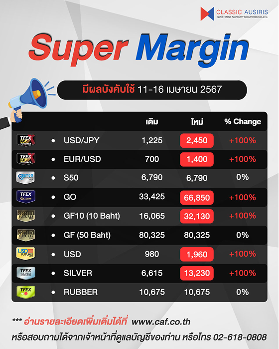 ขอแจ้งตราหลักประกันพิเศษ (Super Margin) เนื่องจากวันหยุดซื้อขาย 3 วันทำการติดต่อกัน (วันที่ 12 ถึง 16 เมษายน 2567) โดยเรียกเก็บเฉพาะสัญญาซื้อขายล่วงหน้าที่อ้างอิงกับสินค้าหรือตัวแปรในต่างประเทศเท่านั้น มีผลบังคับใช้วันที่ 11 ถึง 16 เมษายน 2567 ตั้งแต่เวลา 06.45 น. ถึงเวลา 19.00 น. ของวันที่ 11 เมษายน 2567 ถึง 16 เมษายน 2567